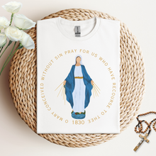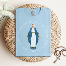 This pure cotton t-shirt features a watercolor image of the Blessed Virgin Mary as she appears on the miraculous medal, accompanied by the words, "O Mary conceived without sin pray for us who have recourse to thee", and the year 1830. In this year, Saint Catherine Labouré, received visions of the Blessed Virgin Mary and was commissioned to have the miraculous medal struck.