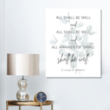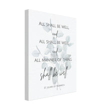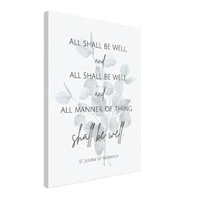 This canvas art print features St. Julian of Norwich's beautiful quote set in minimalist typography, adorned with a eucalyptus leaf floral watermark. A lovely adornment and reminder of peaceful reassurance for any Christian home, this design also makes a touching Mother's Day or birthday gift, or a gift for a friend going through a difficult season of life.