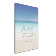 This canvas art print features the beautiful, calming words of Psalm 46:10: "Be Still and Know That I am God". This beloved scripture verse is set on a backdrop of serene, coastal beach waters, in blue, aqua and sand tones. Available in four sizes (8x10", 11x14", 16x20" and 24x36") to suit your space: please measure and order accordingly. A beautiful art piece for any Christian home or cottage, and makes a lovely housewarming gift sure to be cherished.