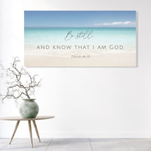 This canvas art print features the beautiful, calming words of Psalm 46:10: "Be Still and Know That I am God". This beloved scripture verse is set on a backdrop of serene, coastal beach waters, in blue, aqua and sand tones. Available in two sizes (36"x12", or 40"x20") to suit your space: please measure and order accordingly. A beautiful art piece for any Christian home or cottage, and makes a lovely housewarming gift sure to be cherished.