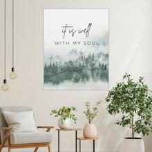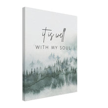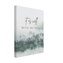 The "It Is Well With My Soul" canvas print brings a touch of calm to any room. This digital wall art piece features beautiful letting on a background of a serene forest landscape.