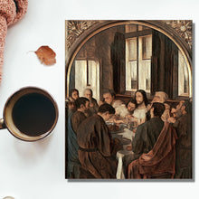 A touching and intimate depiction of the Last Supper of Christ. This unique print was created from a digital reworking of an 1865 painting by Van Heary, which hangs in Sint-Gilliskerk Church, Belgium. The image has been refashioned in earth tones, with a hatching brushstroke effect, giving depth and warmth.