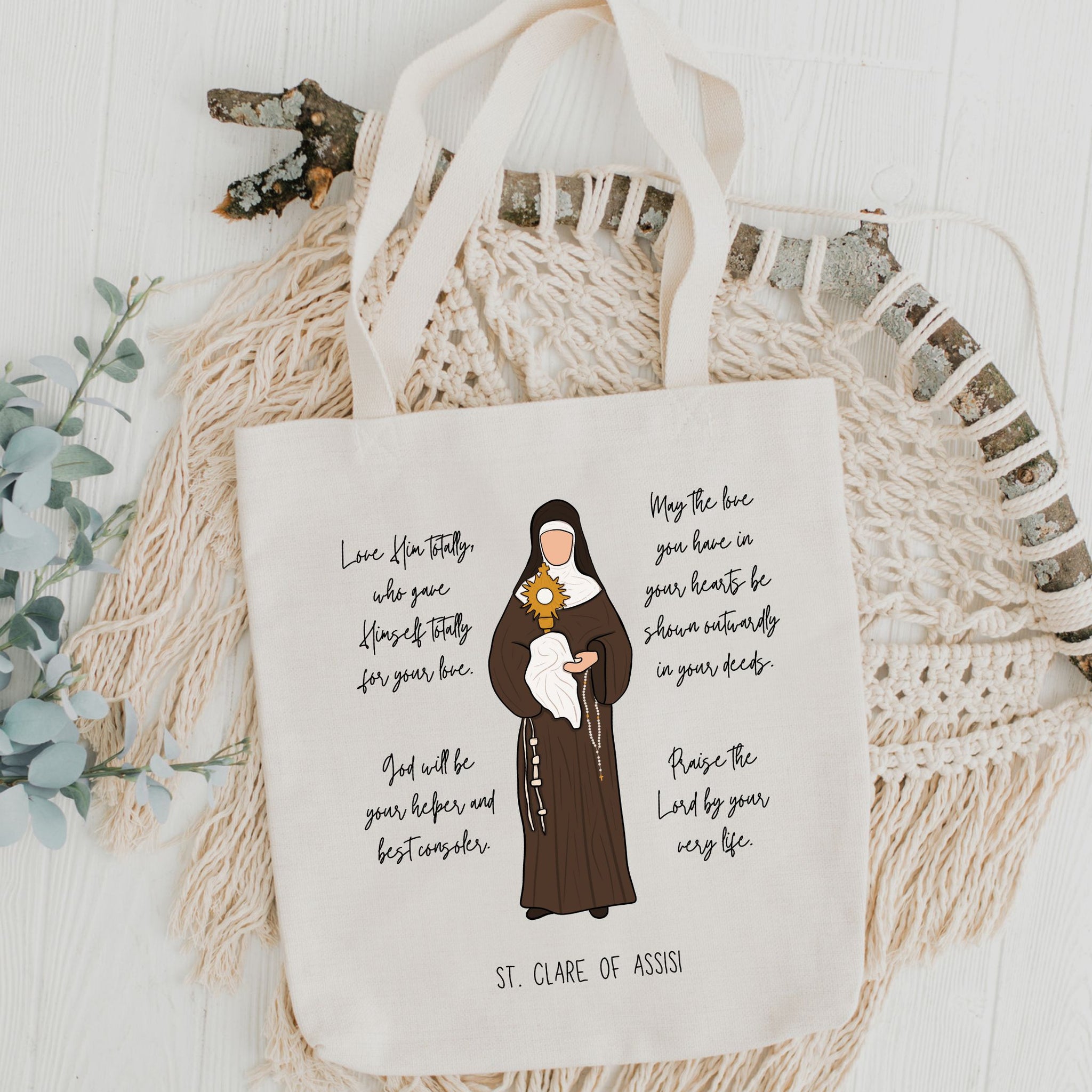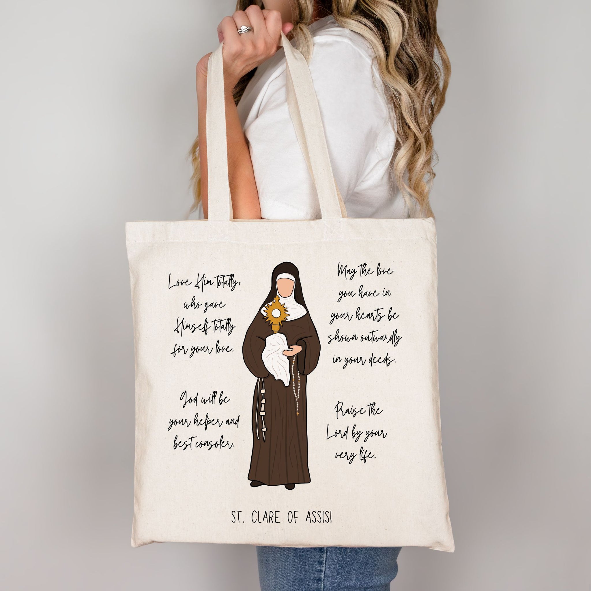 This tote bag features the beloved Catholic saint St. Clare of Assisi, and four of her inspiring quotes: "Love Him totally, who gave Himself totally for your love", "May the love you have in your hearts be shown outwardly in your deeds", "God will be your helper and best consoler", and "Praise the Lord by your very life".
